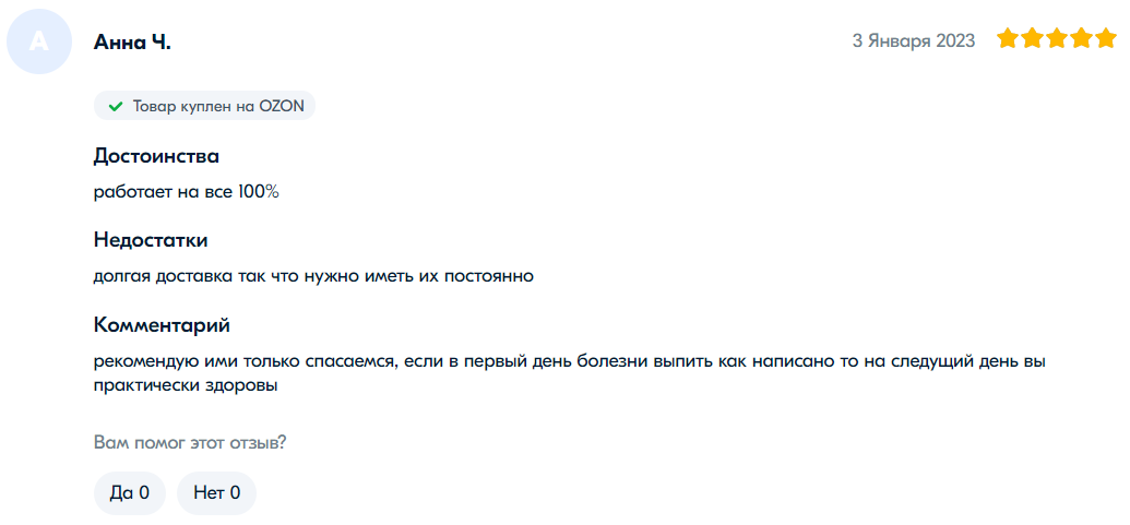 网友“谢尔盖”是前十页评论中唯一认为连花清瘟无效的。他给出了一星评价并表示:“我在出现症状时开始服用,但体温仍然升至38.6度。按照说明书吃了4天,每天12粒(4粒每天3次)后并没有好转。我决定停用并采取其他方法治疗。现在我躺在床上,喉咙剧痛。它可能对很多人有帮助,但并不是万能的。无论如何,选择权在您。我为自己做出了选择。”