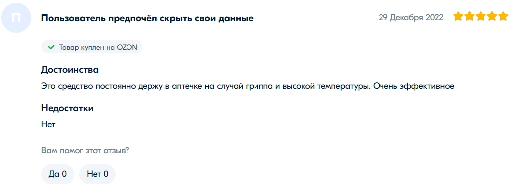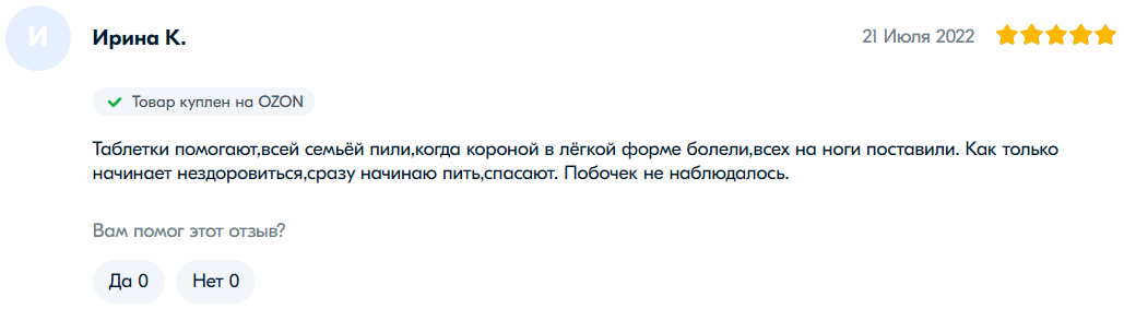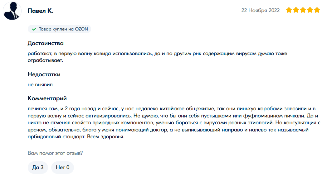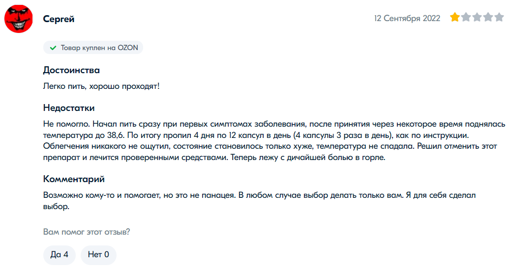 网友“谢尔盖”是前十页评论中唯一认为连花清瘟无效的。他给出了一星评价并表示:“我在出现症状时开始服用,但体温仍然升至38.6度。按照说明书吃了4天,每天12粒(4粒每天3次)后并没有好转。我决定停用并采取其他方法治疗。现在我躺在床上,喉咙剧痛。它可能对很多人有帮助,但并不是万能的。无论如何,选择权在您。我为自己做出了选择。”